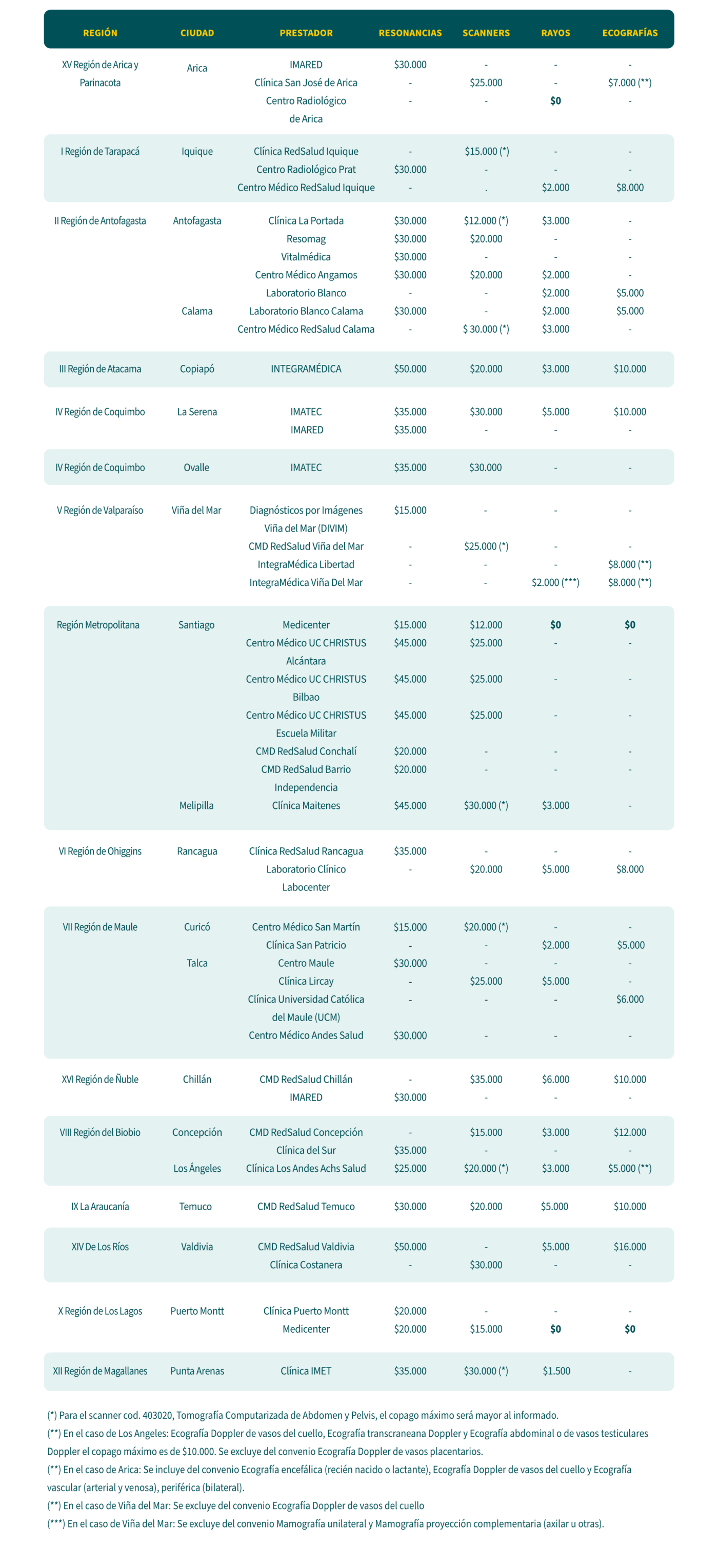 Te contamos sobre nuestros convenios en Santiago y regiones con el mejor valor a pagar en resonancias, scanners, rayos y ecografías. Dependiendo de tu plan, tu copago será como máximo el valor señalado en nuestros prestadores en convenio. (*)